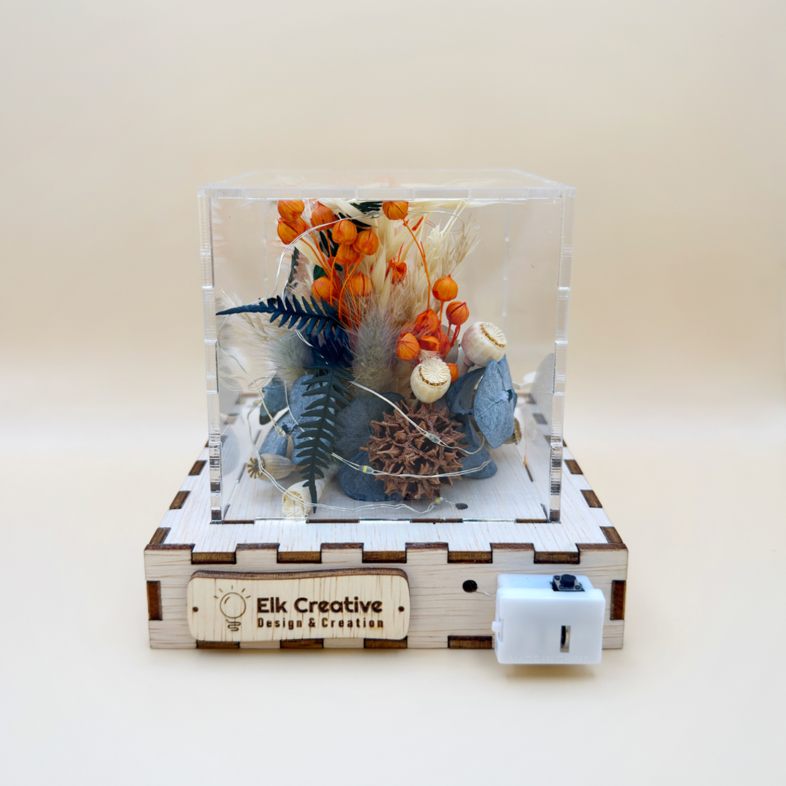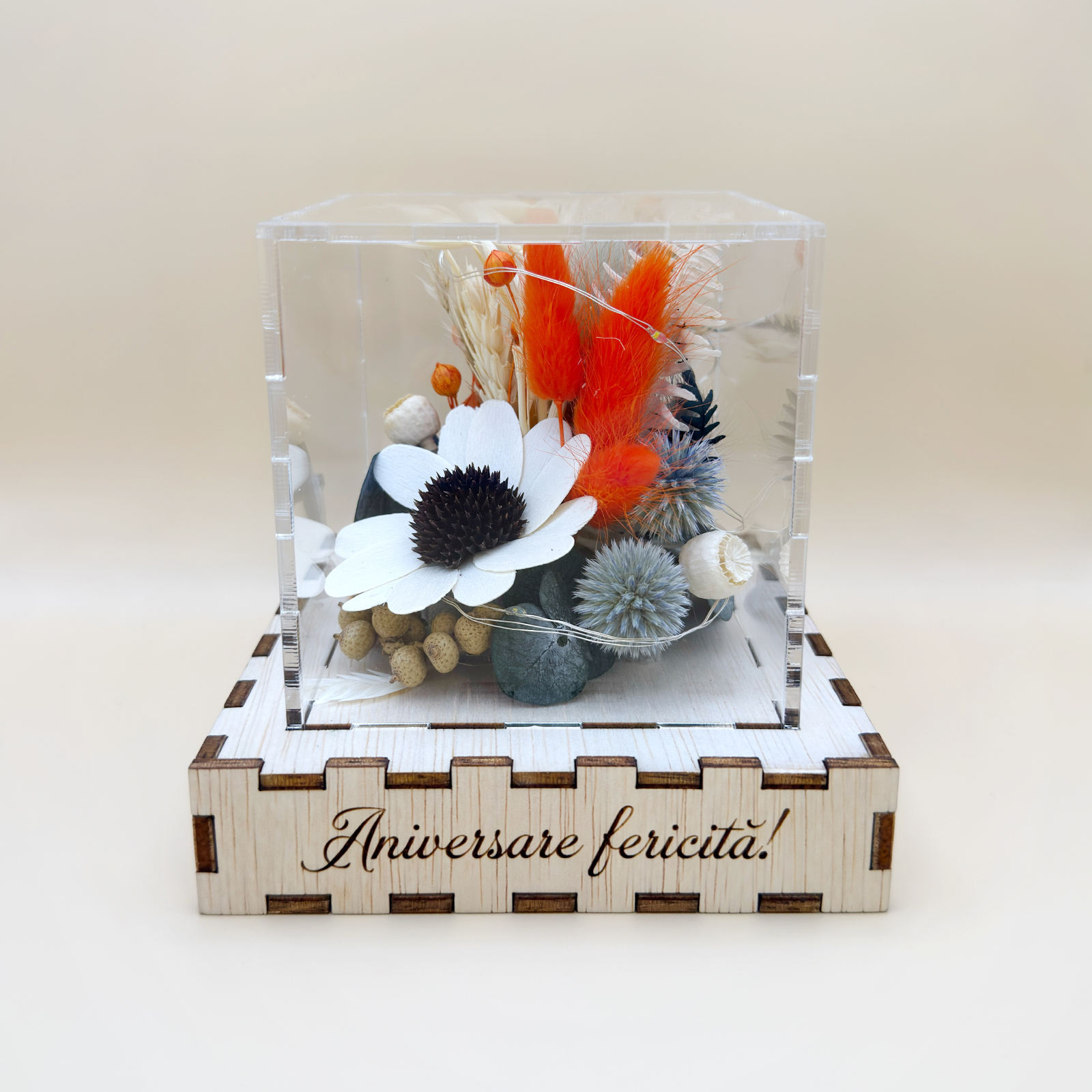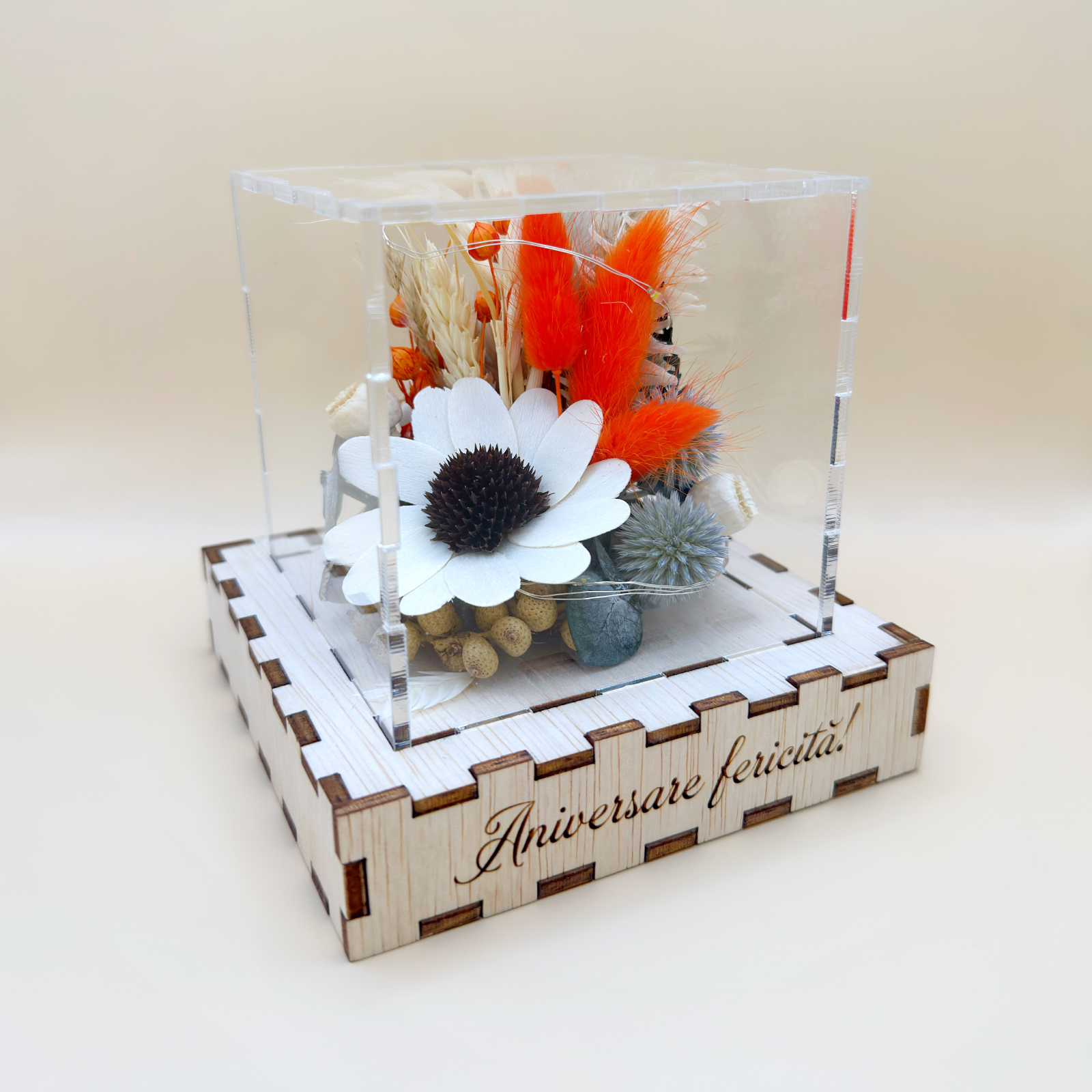 Pentru a proteja această compoziție prețioasă, am adăugat un dome protector din plexiglas transparent de 3 mm grosime – un detaliu care transformă totul într-o piesă de colecție.