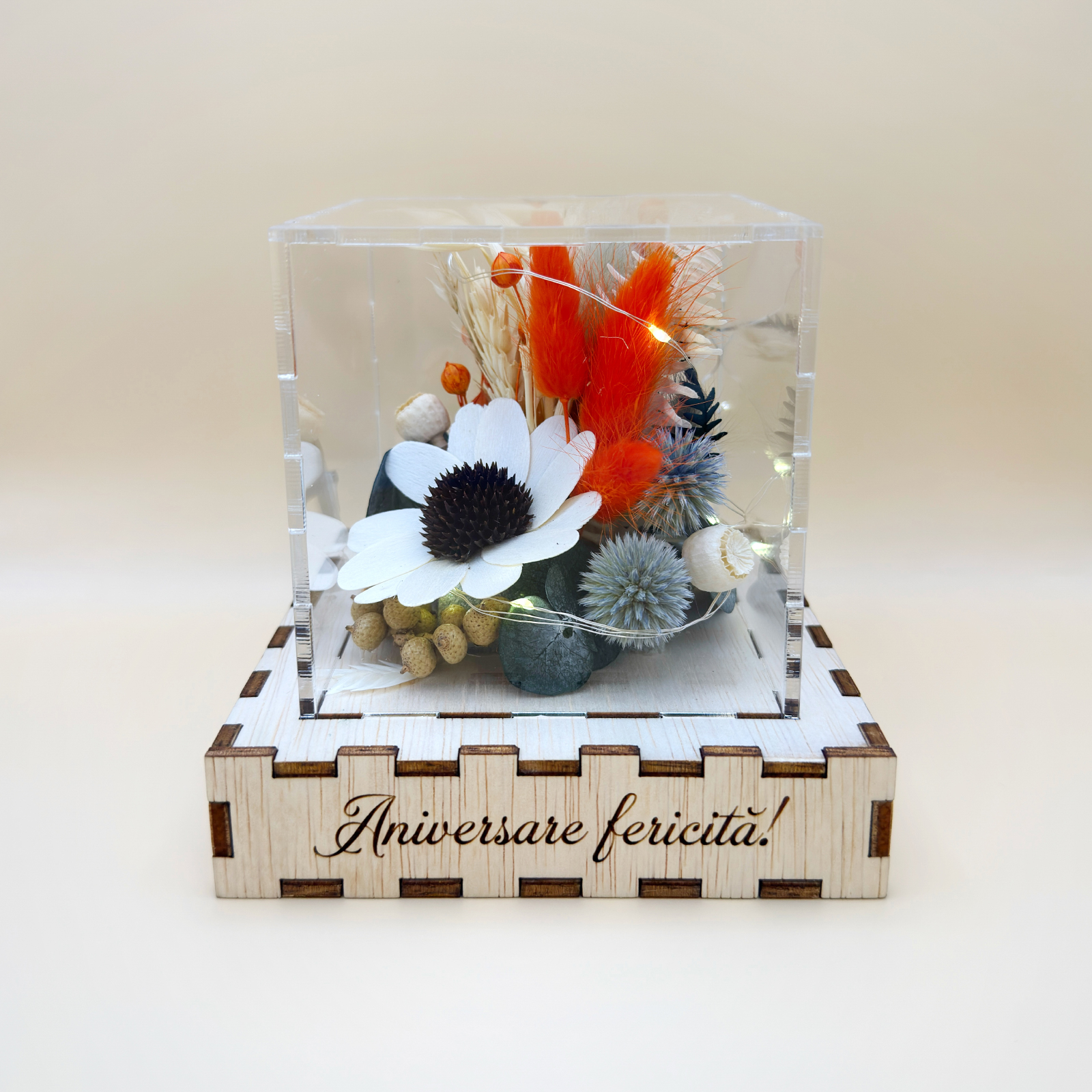 Un cadou unic: cutie luminoasă cadou personalizat, cu lumină caldă și dome protector din plexiglas.
