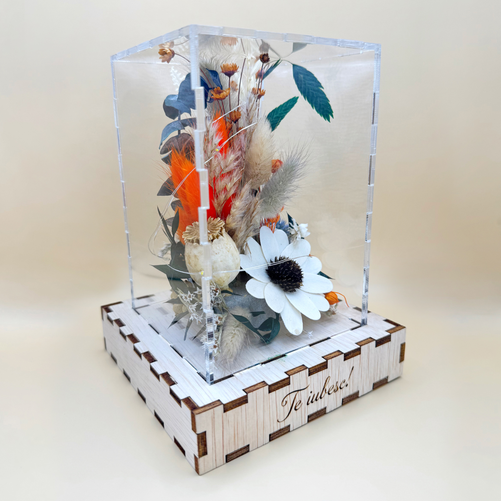 Pentru a proteja această compoziție prețioasă, am adăugat un dome protector din plexiglas transparent de 3 mm grosime – un detaliu care transformă totul într-o piesă de colecție.