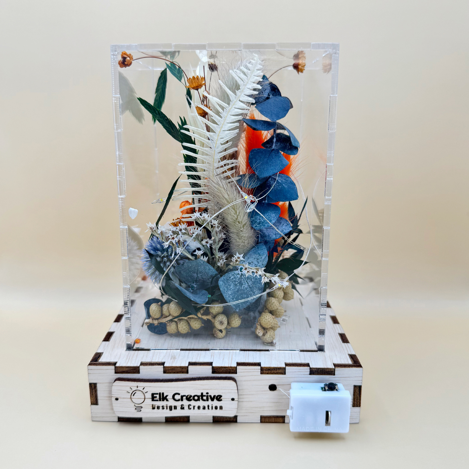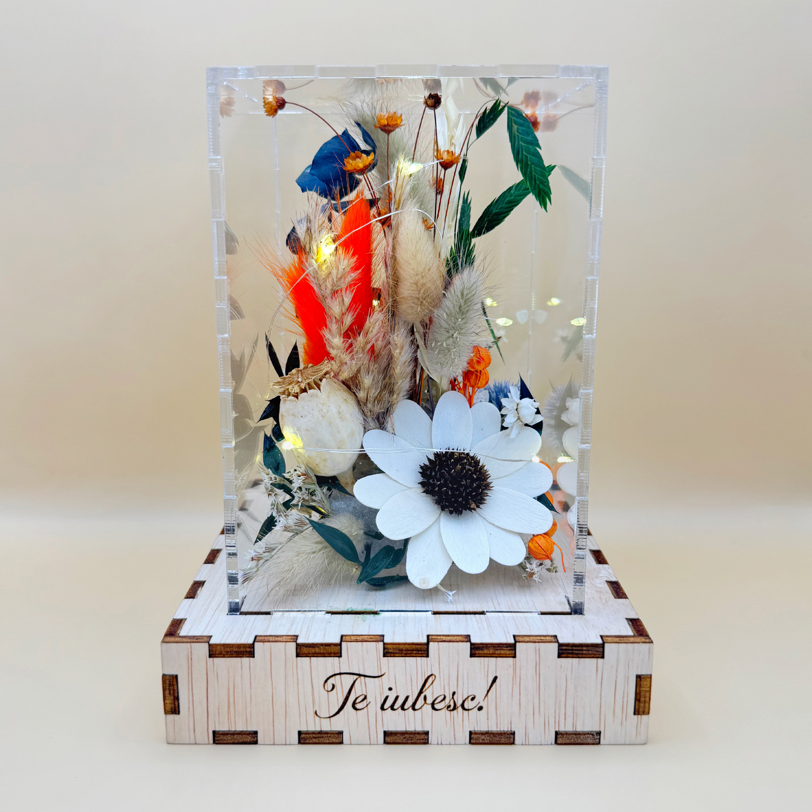 În centrul fiecărei cutii luminoase se află un aranjament floral compus cu eleganță și intenție. Fiecare floare, fiecare detaliu este plasat cu grijă, astfel încât să creeze o armonie vizuală care transmite emoție pură.