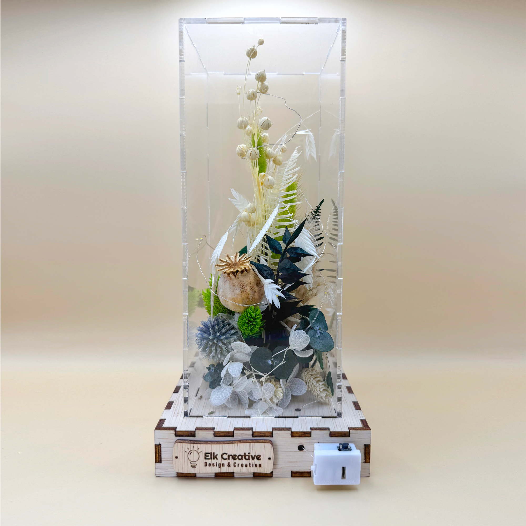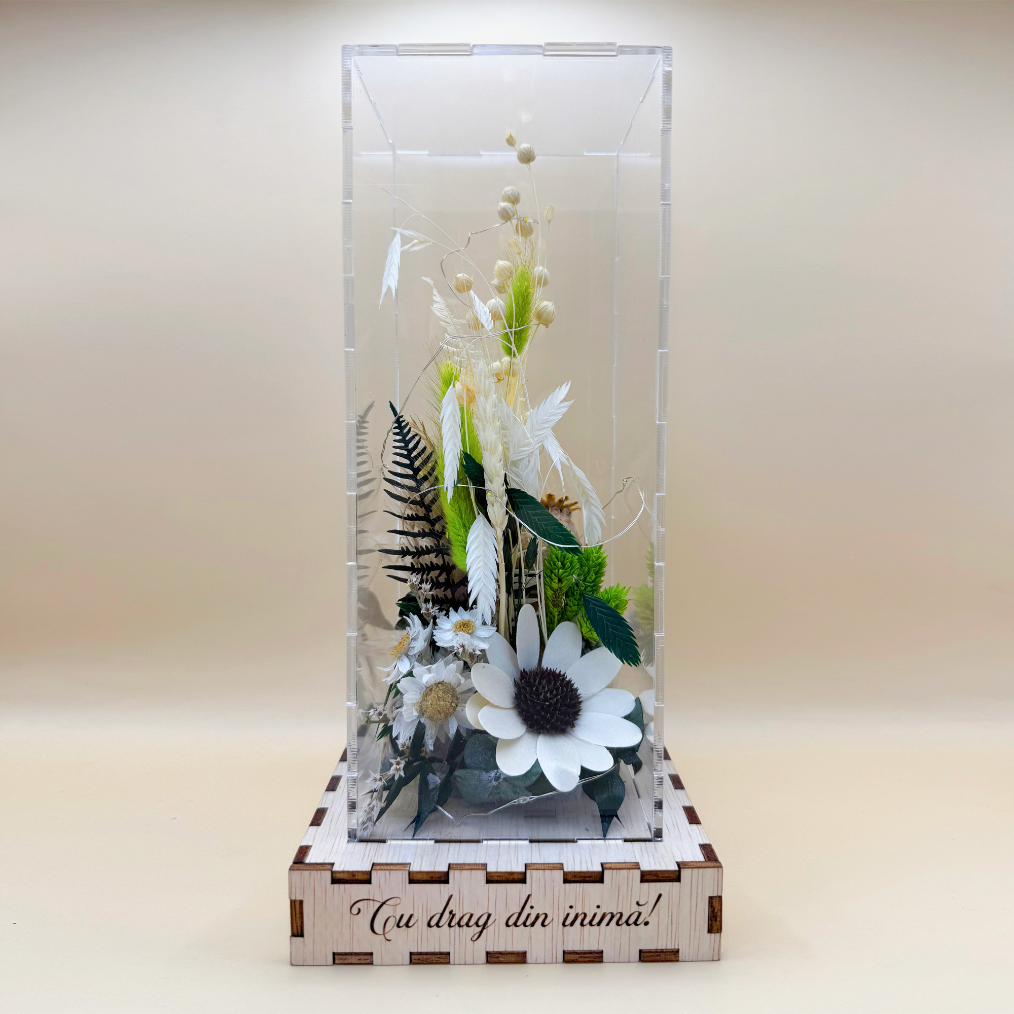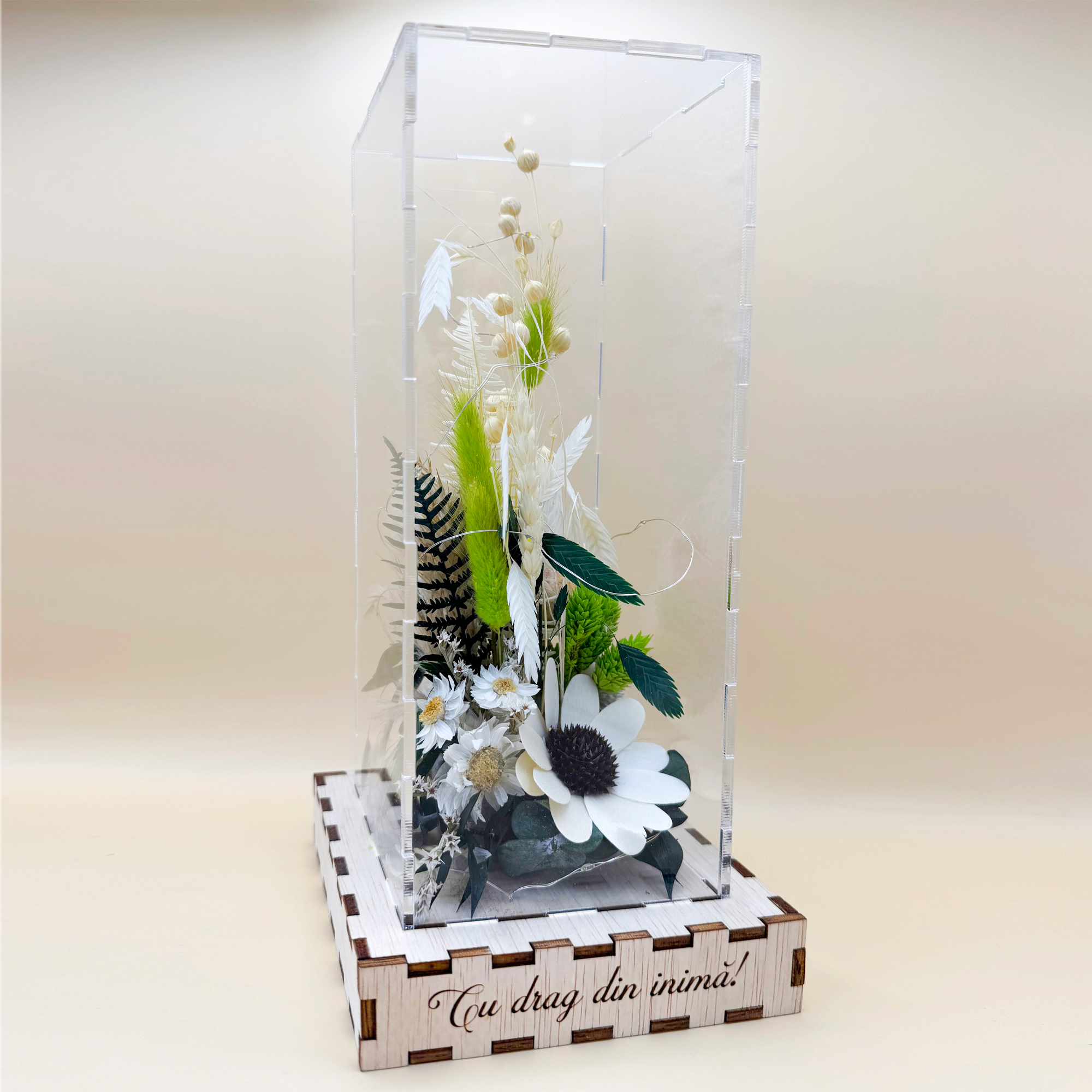 Pentru a proteja această compoziție prețioasă, am adăugat un dome protector din plexiglas transparent de 3 mm grosime – un detaliu care transformă totul într-o piesă de colecție.